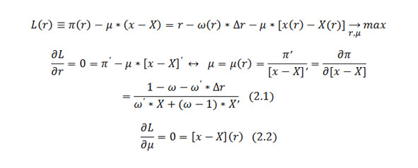 Но занятно то, что как таковой, рутинно-количественный «штраф» в виде конвенционального мю (Лагранж-фактора или мультипликатора) почти лишен смысла ввиду (в меру) ранее оговоренной необратимости, непревышаемости Х чем-либо вроде меньшего х. Впрочем, остается лелеять надежду и здесь обрести простоту, ясность понимания на полноте представления: искомую концепцию качественного размена, где мю, возможно, либо сверхвелико по модулю в критических точках ближе к нижней, нерасторгуемой грани, либо извлекаемо структурно вообще и инуде как этакое функциональное, диофантово решение. Зададим для начала полный лагранжиан и выведем из него условия первого порядка: