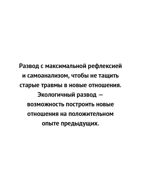 Какой он, экологичный развод или экологичный выход из отношений? Это максимально осознанный, спокойный выход, основанный на умении договориться, принять, понять, простить, выбрать себя и свой внутренний комфорт. Развод с максимальной рефлексией и самоанализом, чтобы не тащить старые травмы в новые отношения. Экологичный развод – возможность построить новые отношения на положительном опыте предыдущих. Выйти из отношений с благодарностью и подарить себе и бывшему партнеру возможность обрести счастье с другим человеком.