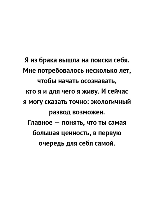 У меня было примерно так. Вроде все нормально, живем, что-то делаем, как-то общаемся. Но меня нет, нет меня в этом браке. Я ощущаю глубокое одиночество, находясь тут, я не знаю, чего хочу и к чему готова. В чем мои интересы, потребности. Где заканчиваются мои границы и начинается брак? Я из брака вышла на поиски себя. Мне потребовалось несколько лет, чтобы начать осознавать, кто я и для чего живу. Сейчас могу сказать точно: экологичный развод возможен. Главное – понять, что ты самая большая ценность, в первую очередь для себя самой.