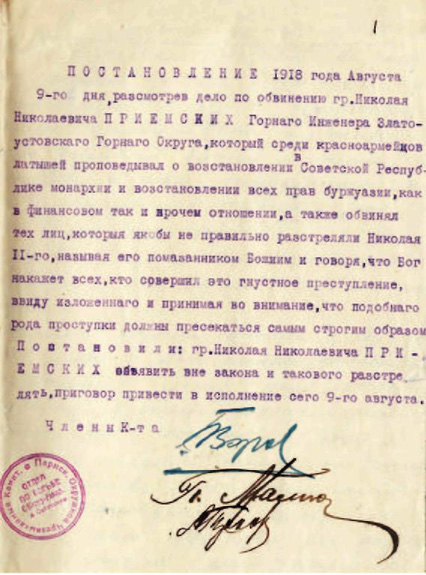 Вероятно, этот список включал расстрелянных по политическим мотивам за август и начало сентября 1918 г. Например, Николай Николаевич Приемских – горный инженер, направленный на Урал в поисках полезных ископаемых, был арестован и расстрелян за монархические убеждения в начале августа[31], а пастор эстонских колоний Август Карлович Ниголь – 17 августа[32].