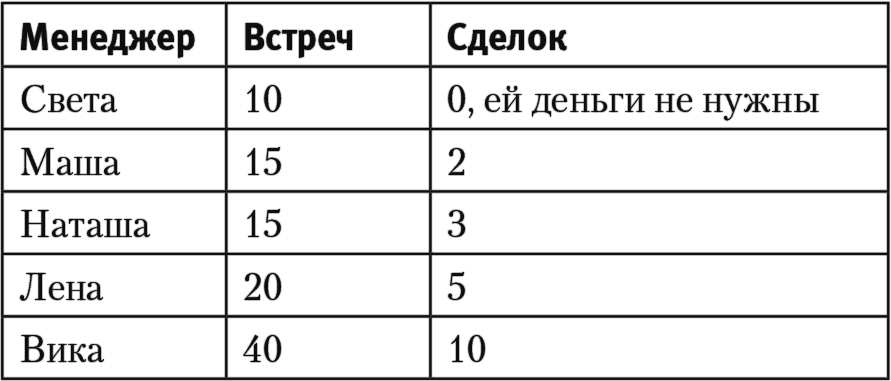 Добавлю мистическое наблюдение. Представь, что у тебя в отделе продаж пять менеджеров, у всех почти одинаковая конверсия (пять встреч дают одну продажу), а вот активность разная. За месяц Света доехала до клиентов десять раз, Маша и Наташа – по 15, Лена – 20, а Вика «наколотила» целых 40.