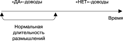 Иоганн Вольфганг ГетеИнтересно, что окраска у этих размышлений меняется со временем. Если ты хорошо и ярко отработал переговоры, заинтересовал клиента и размышления его искренни, то в течение стандартного срока принятия подобных решений клиент взвешивает доводы в пользу твоего предложения. Ему интересно, и он рассматривает «ДА-доводы». По истечении стандартного срока ситуация меняется. Клиент чувствует, что решение не принято, и находит объяснения, почему он предложение не принял. Клиент отдаляется и ищет «НЕТ-доводы».