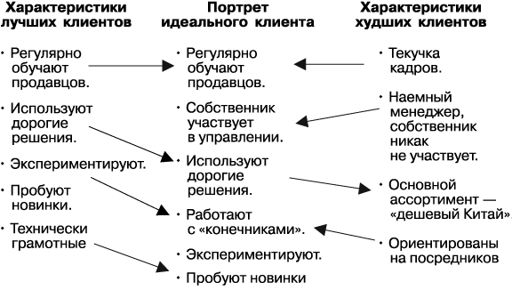 Портрет идеального клиентаСочетание тебя, твоей компании и ваших решений уникально. Кому-то этот сплав полезен, а кто-то вас на дух не переносит. Попробуй выделить особенности своих сторонников. Возьми пять своих лучших клиентов (приносят достойную прибыль и «вменяемы» при взаимодействии) и пять худших. Проанализируй – чем лучшие похожи друг на друга и что объединяет худших. Результаты по худшим «переверни» (умножь на –1).