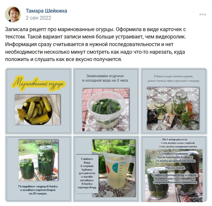 Записала рецепт, стала готовить и фотографировать основные моменты. Получилась серия картинок под названием «Маринованные огурцы», которую вложила в социальную сеть «ВКонтакте». Рецептом было удобно пользоваться с телефона. Открывала свою страничку «ВКонтакте» и готовила по правилам.