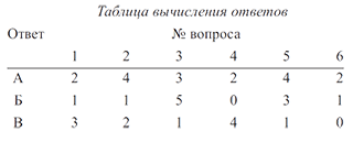 Затем по таблице, помещенной на стр. 10, выберите ответы и подсчитайте количество, набранных вами очков.