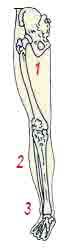 Костный скелет ног (см. рис. 5) состоит из бедренной кости (1), двух костей голени (2) и костей стопы (3). Кости голени состоят из большеберцовой и малоберцовой костей.