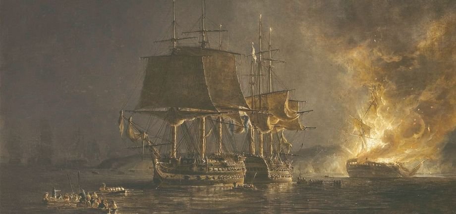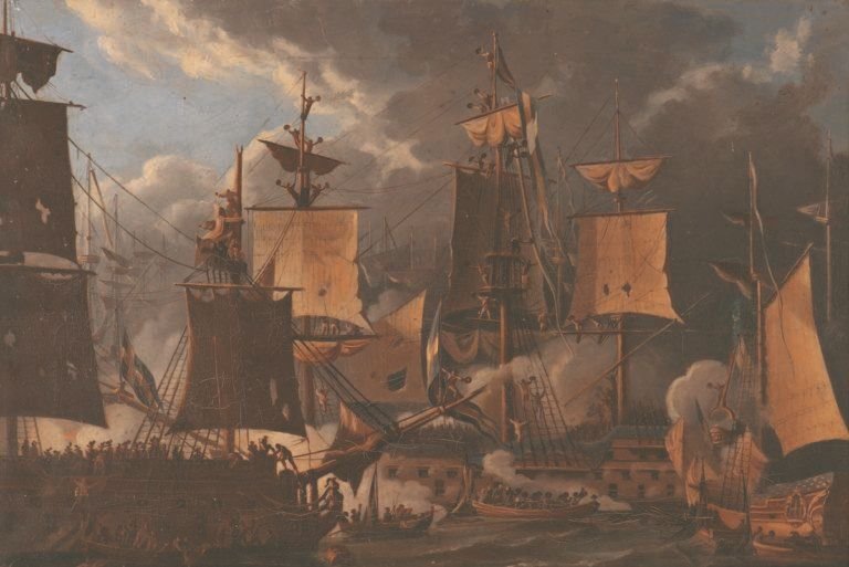 …Выстроившись друг против друга, оба флота продолжали поражать друг друга в упор. Побоище давно стало всеобщим. Лишь иногда выстрелы внезапно стихали – это из-за густого порохового дыма враги теряли друг друга из вида. Однако стоило пороховым облакам хоть немного рассеяться, как дуэль начиналась с еще большим ожесточением.