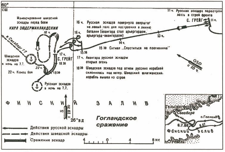 Из хроники сражения: «В половине 7 часа, в передних кораблях шведского флота, уже заметно было замешательство. Шведский генерал-адмиральский корабль, разбитый “Ростиславом”, пошел за линию на буксире; спрятались еще за линию, два передовых их корабля и один из находившихся между “Ростиславом” и “Изяславом”. Прочие шведские корабли, следуя передовым и своему адмиральскому, тоже спустились и стали смыкать линию. Это был первый сигнал к победе! На наших кораблях раздались крики “ура”; все, даже отсталые, Фондезина, погнались за неприятельским флотом и уже с большею бодростью вступили в дело».