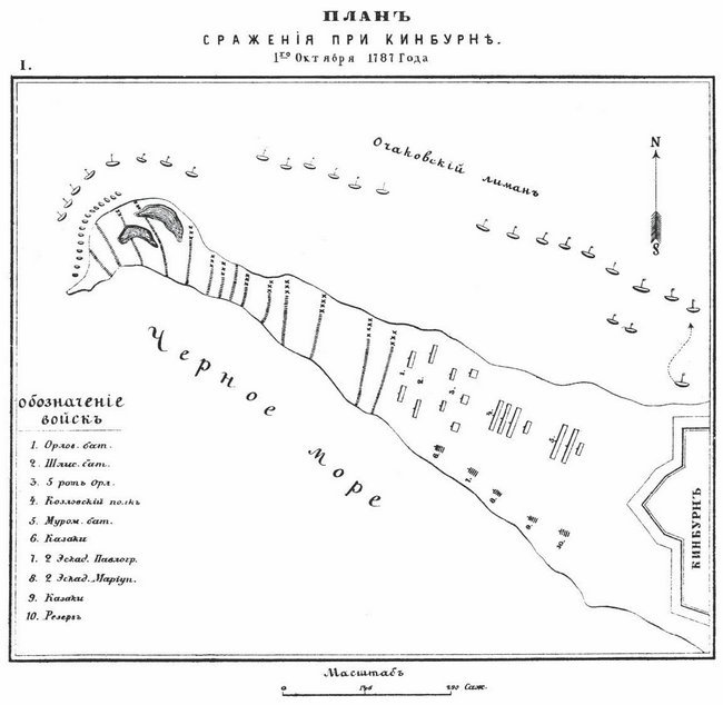 Из хроники сражения: «Около 9 часов неприятель подошел к косе с двух сторон: на запад от Кинбурна, на самой оконечности косы, стали высаживаться с кораблей турки; восточнее Кинбурна, верстах в 12, пытались высадиться запорожцы, бежавшие в Турцию. Запорожская высадка была демонстрацией, для отвлечения русских от главного пункта атаки. Казаки приняли, было, запорожцев за русских беглецов, добровольно возвращающихся под свои знамена, но недоразумение скоро разъяснилось, и запорожцы были прогнаны. Высадка же турок на оконечность косы производилась беспрепятственно, под руководством французских офицеров; кроме того, для прикрытия судов, турки вбивали в морское дно, невдалеке от мыса, ряд толстых свай…Турки высаживались с шанцевым инструментом и мешками и тотчас же принимались с поспешностью рыть неглубокие ложементы, наполняя мешки песком и выкладывая из „их невысокие бруствера. Ложементы велись поперек косы, от Черного моря к Очаковскому лиману, до которого, однако, не доходили, ради беспрепятственного движения войск, причем свободное пространство загораживалось переносными рогатками. Ложементы вырывались параллельно один другому, по мере движения турок вперед; всех их было 14 или 15. При десанте турки имели всего одну пушку, взятую когда-то у русских“.