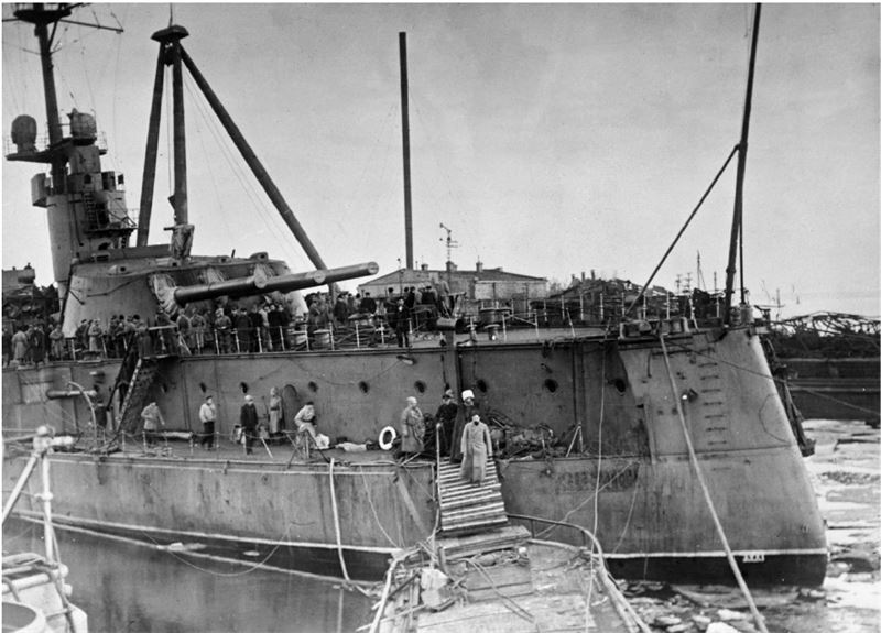 Павел Дыбенко и Александр Седякин после митинга спускаются с линкора "Севастополь"