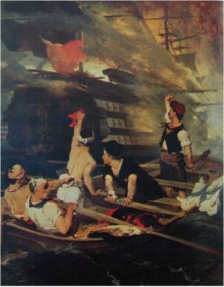 Бессмертный подвиг совершил уроженец острова Псары Константин Канарис[2]. Храбрец темной ночью подкрался на брандере к стоящему на якоре в Хиосском проливе 84-пушечному флагману капудан-паши и подпалил его. Турки пытались потушить свой линкор, да куда там! От взрыва корабль взлетел на воздух, а вместе с ним и более двух тысяч турок, включая самого Кары-Али. Данное султану слово капудан-паша сдержал…