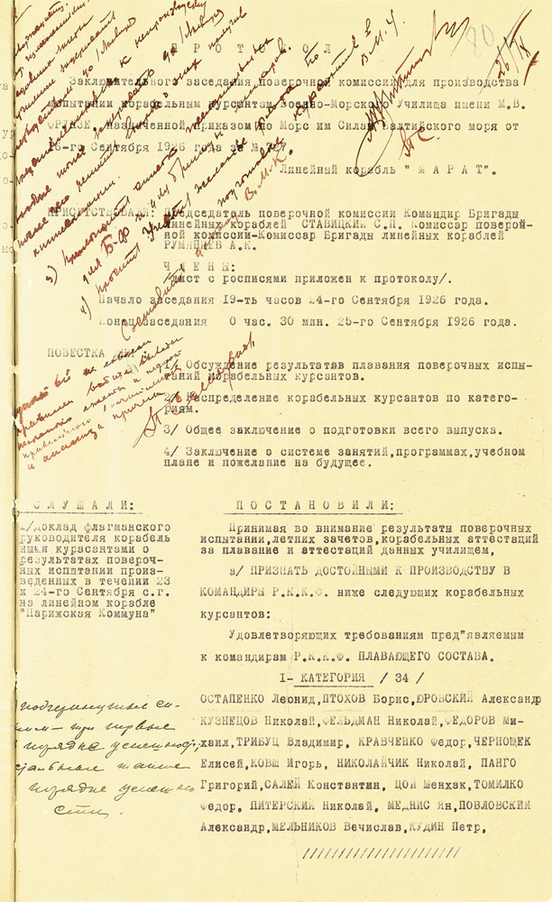 Список выпускников ВМУ имени М.В. Фрунзе 1926 г., кому было предложено продолжить службу на Балтийском флоте. Вторым в списке – Н.Г. Кузнецов. Из фондов ЦГА ВМФ. Публикуется впервые