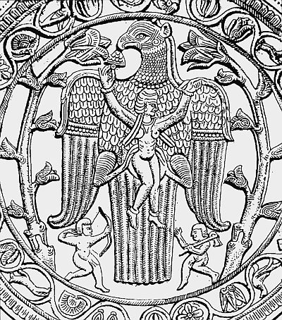 Авестийская богиня Ардви-Сура возносится на небо священной птицей Симург. Блюдо Сасанидской эпохи