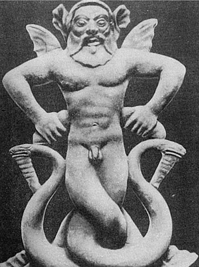 Древнеегипетский Тифон был злобным духом и почитался как бог. Был египетский Тифон гигантом и имел сто змеиных голов. Сам он был полностью покрыт перьями, а ноги его были увиты змеями. Здесь сразу же видна аналогия и с «нашим» Хорсом: «наше» божество стоит ногами на змее, египетский Тифон вообще имеет змеевидные ноги. Да и греческого Тифона античные художники чаще всего изображают тоже с двумя извивающимися змеями вместо ног. Но что символизировали в ту далекую от нас пору ноги в змеях? Опять загадка!