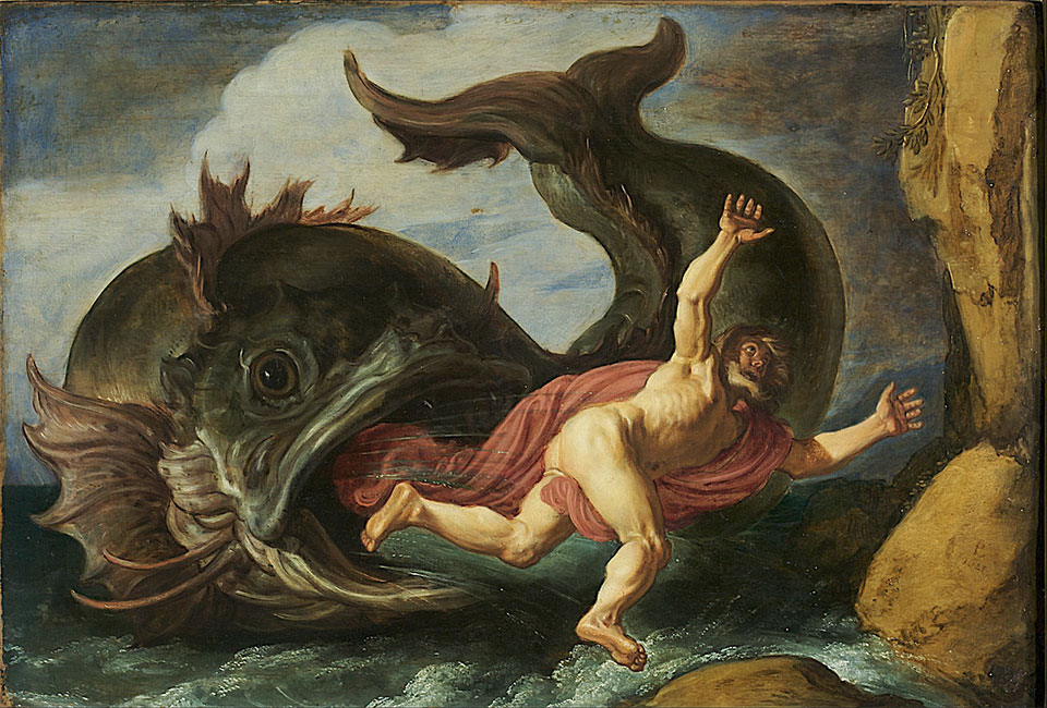 Моряки-язычники, естественно, не находят ничего лучшего, как принести своего пассажира в жертву морю, дабы умилостивить и успокоить последнее. Бедного Иону попросту выбрасывают за борт. Однако, пророк все же кое-как удерживается на плаву. Однако его настигает еще одна беда, да какая! Иону обнаруживает некая кровожадная рыба-кит, которая и проглатывает беднягу целиком.