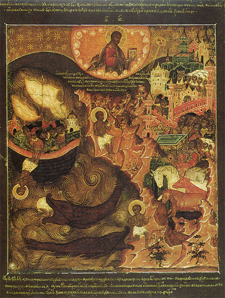 Согласно церковному преданию пророк Иона жил в VIII веке до Рождества Христова. Однажды Господь послал Иону нести слово Божие в средиземноморской город Ниневию, жители которого отличались особой свирепостью нравов. Испуганный перспективой встречи с ними, Иона решает бежать на попутном судне в более снисходительный к миссионерам-христианам Фарсис. Однако во время плавания судно попадает в сильный шторм.
