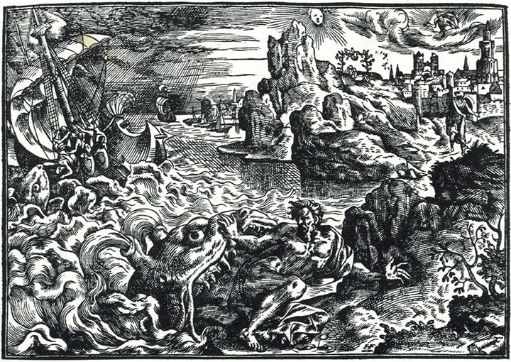 В знаменитом трактате средневековья «Книга о зверях и чудовищах» Фомы из Кантипрэ (ХШ век) сказано следующее: «Кит – самая большая из рыб: в море встречаются особи, достигающие четырех югеров. У них маленькая глотка, через нее можно проглотить только мелкую рыбешку, которую к китам привлекает запах, исходящий из их пасти. Кит поглощает рыбу и наполняет ею свою утробу. В горле у него располагается пелена наподобие мембраны, в которой множество отверстий, и, таким образом. Большая рыба не может оказаться у него в животе. Пасть у него широкая и большая. Считается, что именно там оказался проглоченный пророк Иона, ибо в пасти для него нашлось бы достаточно просторное убежище… Рот у него на лбу. Эти звери иногда, глотая, поднимают такое волнение, словно сильная буря, и могут потопить на дно целый флот. Иногда они топят корабли, задевая их на плаву или разворачиваясь. Когда на море поднимается буря. Они ложатся на волны…