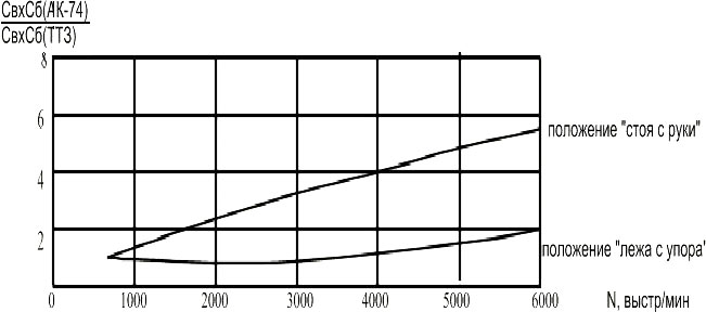 Сопоставляя приведенные характеристики нетрудно заметить, что реально достигнутые на автомате АК-74 значения параметров рассеивания весьма далеки от заданного уровня и для обеспечения требуемой величины кучности стрельбы нового автомата необходимы радикальные решения. Следует, однако, еще раз отметить, что результаты испытаний штатных образцов опытными и войсковыми стрелками несоизмеримы. Так кучность стрельбы из автомата АК-74 при оценке опытными стрелками как и при стрельбе из автомата АКМ в среднем в 5 раз выше, чем при оценке войсковыми автоматчиками. Именно это обстоятельство обусловило необходимость оценки конкурсных образцов неопытными стрелками.