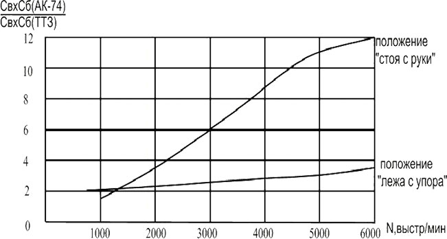 Рис. 2 показывает, что для систем со сбалансированной автоматикой повышение кучности стрельбы в 5–10 раз может быть обеспечено при достижении темпа стрельбы порядка 4000–5000 выстр/мин.