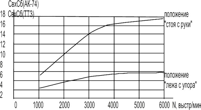 – кучность стрельбы из автомата при испытаниях неопытными стрелками автоматическим огнем на дистанции 100 м по площади сердцевин рассеивания должна составлять для положения «лежа с упора» – 500 см. кв., «лежа с руки» – 2500 см2, «стоя с руки» – 4500 см2.