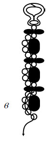 После того как сплетена цепочка дуг из красного бисера, надо перейти к плетению 2-й цепочки, но уже из розового бисера, по аналогичной схеме. Закрепив 3-ю нить на замочке, пропустить ее через маленькую бусину и розовую бисеринку. Набрать несколько розовых бисеринок (количество определяется величиной бусин и размерами дуг из красного бисера) и пропустить нить через нижнюю розовую бисеринку ближайшего крестика. Затем провести нить через последнюю бисеринку дуги и набрать такое же количество розовых бисеринок для следующей дуги. Далее пропустить нить через нижнюю розовую бисеринку следующего крестика и через последнюю бисеринку вновь набранной дуги. Продолжать цикл плетения цепочки до конца ожерелья (рис. 13 г).