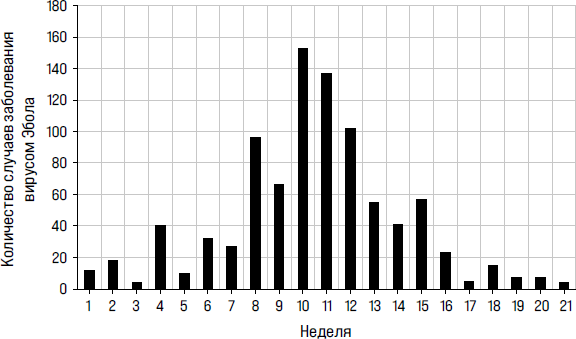 Рис. 3.1. Пример эпидемической кривой, отражающей количество новых зарегистрированных случаев заболевания вирусом Эбола по неделям в округе Лофа в Либерии за период с 8 июня по 1 ноября 2014 года.