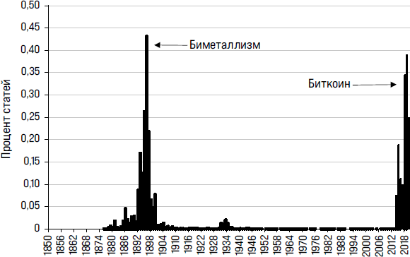 Рис. 3.2. Процент статей, в которых использовано слово «биметаллизм» или «биткоин», по годам в новостных ресурсах и газетах за период с 1850 по 2019 год. Показательно, что процесс протекания двух спровоцированных этими валютными инновациями эпидемий, разгоревшихся с разницей в сто лет, соответствует эпидемической кривой, изображенной на рис. 3.1.
