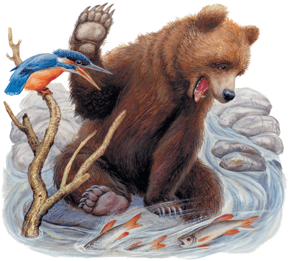 На лесной реке, на крутой излучинке Медведь рыбу ловит. Сидит на большом камне, лапу вверх задрал – ждёт.