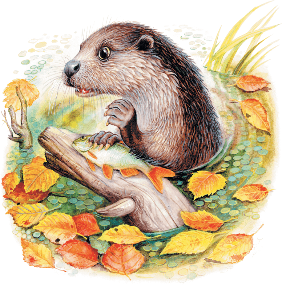 Скользнула Выдра в воду, погналась за голавликами. Быстро плывёт, изгибается в струях, как змейка. Настигла рыбу, кинулась, цопнула, – и вот уже вылезает на берег с Голавликом в зубах.