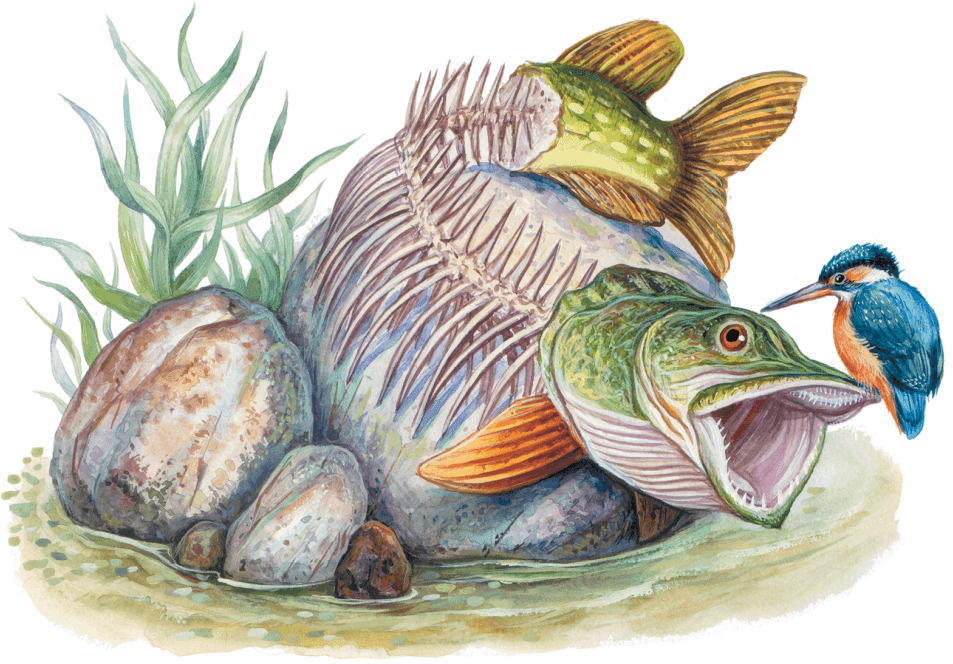 Надвигается на камень большая волна, плывёт мимо камня громадная Щука. Спина – как бревно, зубы – как шилья, на голове мох зеленеет… Страшилище!