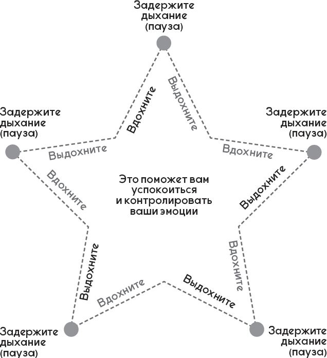 ЗВЕЗДНОЕ ДЫХАНИЕОтличная практика, позволяющая взять под контроль сильные сложные эмоции. Все достаточно просто: откройте схему звездного дыхания (см. ниже), возьмите карандаш, поставьте его на указанную точку и начинайте дышать, выполняя указания на схеме. Упражнение займет всего несколько минут и позволит «поймать» наиболее комфортный и успокаивающий ритм дыхания.