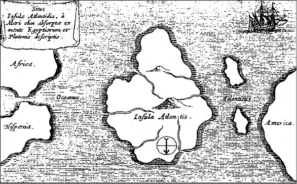 Карта Атлантиды из «Mundus Subterraneus» Атанасиуса Кирхера 1665 года также строго следует Платону. Кирхер (1602–1680), священник-иезуит, опубликовал карту, которую некоторые авторы считают репродукцией древней египетской карты Атлантиды. Якобы манускрипт был вывезен из Египта римлянами в 30 году до нашей эры после падения Клеопатры, последней царицы Египта до отбытия в Рим