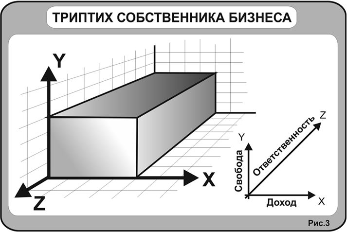 Развивая такой подход далее, перейдём в трёхмерный мир. Это мир 3D с осями X, Y, Z, в котором мы живём, и в котором постараемся графически изобразить собственника бизнеса. Абстрактно, предпринимателя следует рассматривать как параллелепипед. Это такой кубик со сторонами различной величины, проще говоря. Три стороны – это три составные части, три ипостаси собственника, а именно: (X1, X2) – величина его дохода от бизнеса; степень его ответственности за своё дело (Z1, Z2); и возможность распоряжаться собственным временем (Y1, Y2). С позиции евклидовой геометрии сказанное можно представить в виде триптиха, который выглядит как на Рис. 3.
