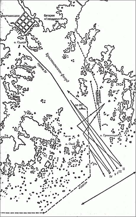 Как уже говорилось, береговая крепость «Кристиансанн» состояла из шести батарей, вооруженных 15 орудиями 150–240‑мм калибра. Самыми опасными для германских кораблей являлись батареи лежащего прямо перед портом острова Оддерё, обойти который было нельзя. В 2,5 км на северо-восток находилась батарея «Глеодден».
