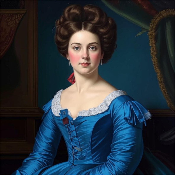 Те же холодные оттенки. Голубой в обилии используется для изображения длинной шали, которая свободно лежит на плечах, частично прикрывая платье, шляпка также имеет голубой цвет. Создается такое впечатление, будто густые, сильно напудренные волосы молодой дамы тоже имеют голубоватый оттенок. Снежно белый цвет кожи девушки заставит восхититься любого человека. Внешне невозмутима, с загадочным, пронизывающим взглядом темно-карих глаз. Темные, тонкие брови и небольшая здоровая румяность молодых щек. Локоны дамы уложены таким образом, что наблюдающий видит, как сзади они касаются нежных плеч. А на конце темной шелковой ленты, завязанной под подбородком, виднеется золотое распятие. И, если бы не лицо, то портрет вполне можно было принять за оригинал. Но, сразу становится понятно, что это копия, так как лицо было написано с другой модели.