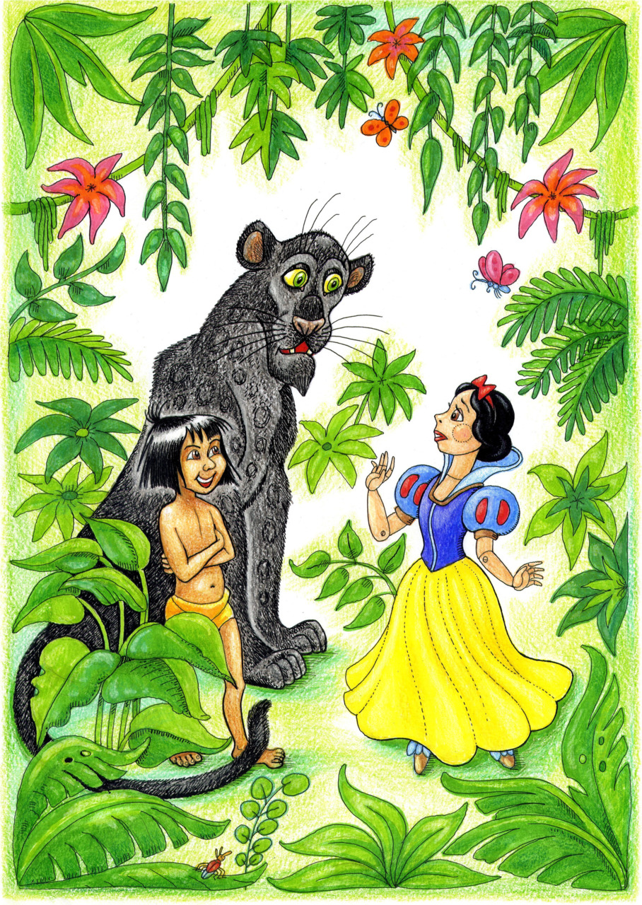 Белоснежка обернулась. Перед ней стоял смуглый, растрепанный и почти голый мальчишка. Это был Маугли. Рядом с ним черной тенью застыла красавица пантера Багира.