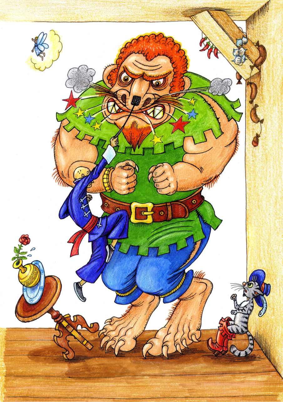 Из ноздрей у него повалил дым. Когда дым рассеялся, людоед, превратившийся во льва, прыгнул на Брыся. Тот сделал сальто через перила и упал прямо в ящик с мороженым.