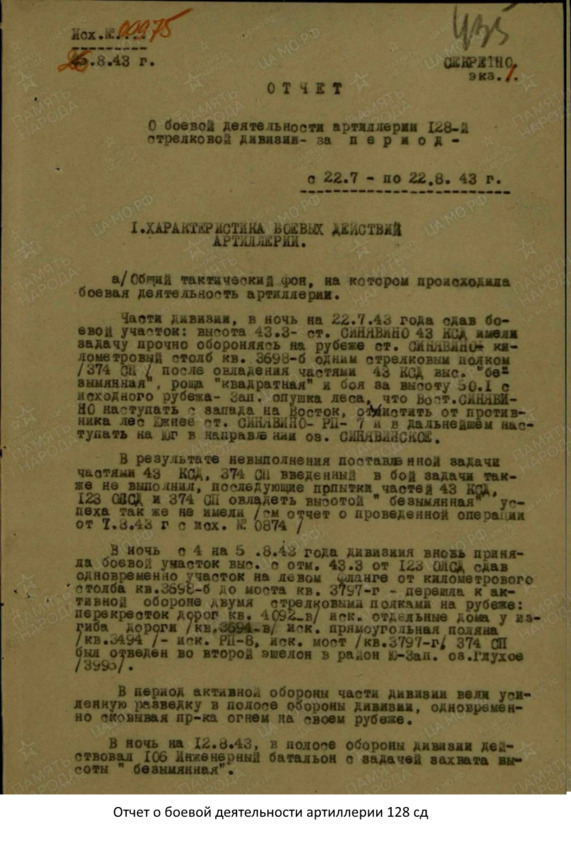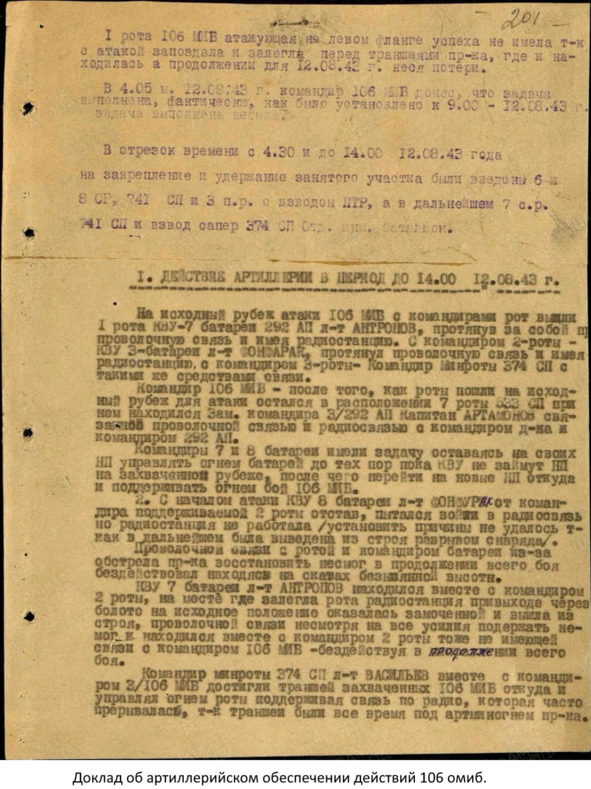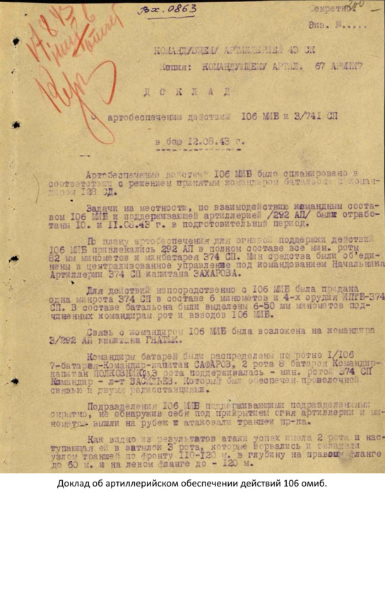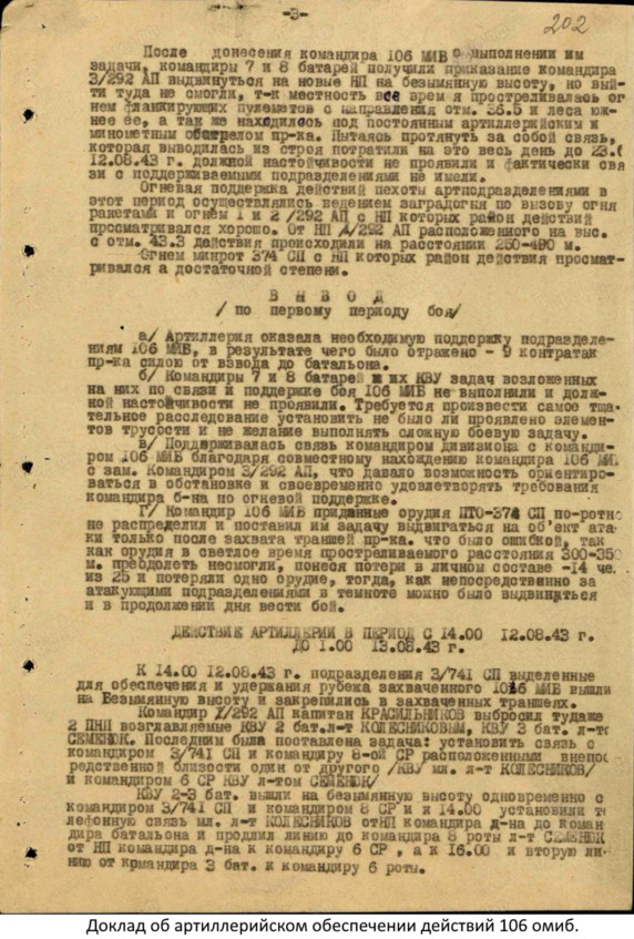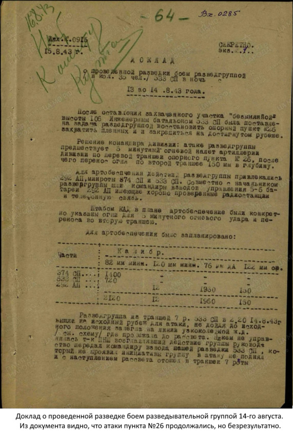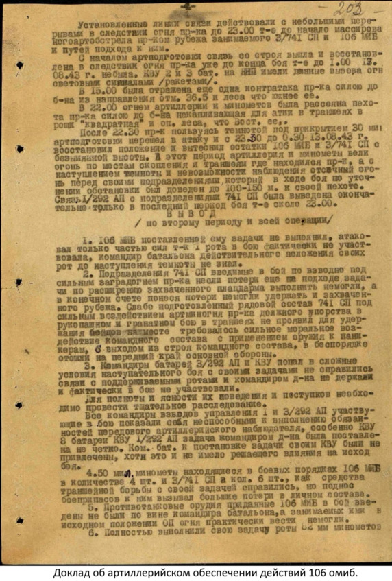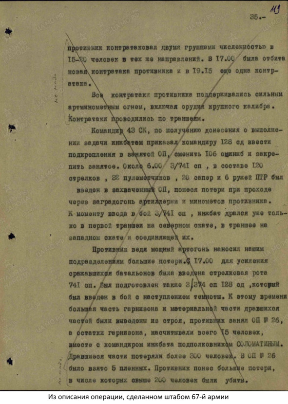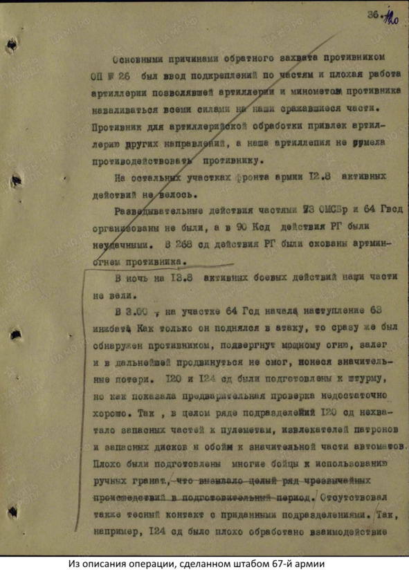 Как мы можем узнать из советских документов, сапёрам 106-го батальона ночью удалось захватить лишь часть укрепленной позиции №26. Утром в бой был введён батальон 741-го полка 128-й стрелковой дивизии. Это ещё целых 309 человек. Но большая часть не дошла до занятых сапёрами траншей: часть была уничтожена, какая-то часть не пошла. Немцы постоянно контратаковали и вели сильный артиллерийский обстрел. Весь день шли ожесточённые бои, и после огромных потерь, наши войска оставили захваченные позиции.