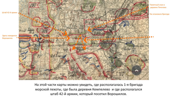 «…отправились осматривать Красногвардейский УР. И наконец, прибыли в район деревни Кемпелево. Здесь командующий 42-й армией генерал Ф. С. Иванов доложил маршалу, что морская бригада с шестью танками КВ уже перешла в атаку с задачей перерезать шоссе Ропша – Красное Село.