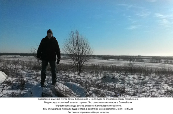 Я со своей стороны побывал у деревни Кемпелево, и могу сказать, что по описанию адъютанта всё выглядит очень похоже. Сама деревня расположена на склоне, но если немного подняться выше, то открывается отличный обзор на те места, где и шла в атаку 1-я бригада морской пехоты. Местность изменилась не очень сильно, только коттеджей современных построили много, но восстановить ход событий можно.