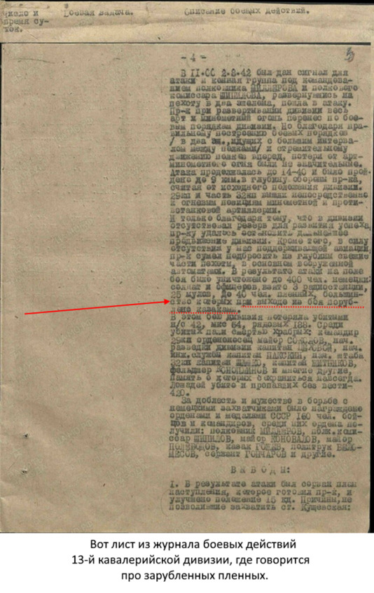 Но вспомнил я об этом, просматривая журнал боевых действий 13-й кавалерийской дивизии. А в нём написано, что в ходе боя 2-го августа было уничтожено до 400 немецких солдат и офицеров, и 40 взято в плен. При этом большинство пленных было порублено казаками при выходе из боя.