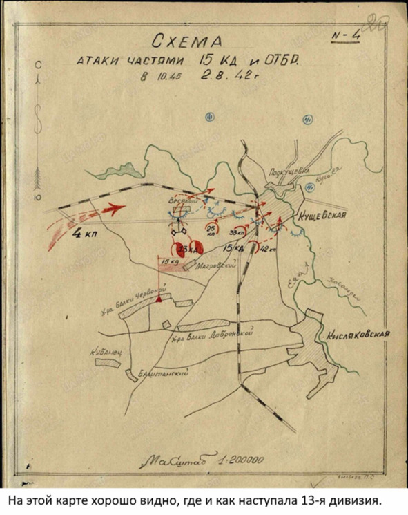 Кавалерия в конном строю сопровождала танки в наступлении. Это обычная практика Второй Мировой, когда конные части заменяли собой мотопехоту. Но не следует путать наступление и атаку. В конном строю казаки 13-й дивизии Кущёвскую не атаковали, они до неё вообще не дошли. Столкновения происходили в ходе наступления, видимо, на полях кукурузы и подсолнечника, что совершенно не противоречит, как описаниям немцев, так и упоминаниям кавалеристов о сабельной рубке.