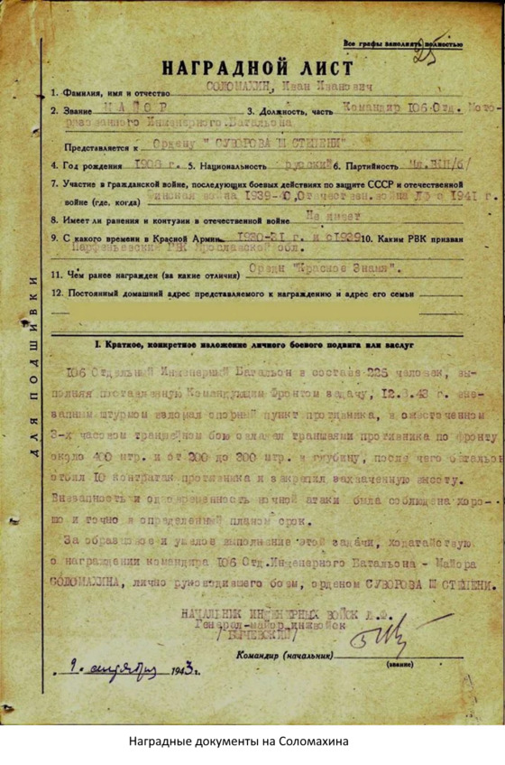 История эта известна в первую очередь по рассказу непосредственного её участника, Ивана Ивановича Соломахина, в 1943 году командира 106-го отдельного моторизованного инженерного батальона.