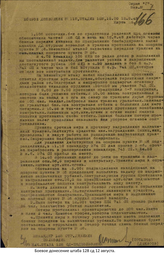 «Более 200 гитлеровцев было убито, 120 захвачено в плен. Инженерный батальон потерял 16 человек убитыми и 26 человек ранеными.».