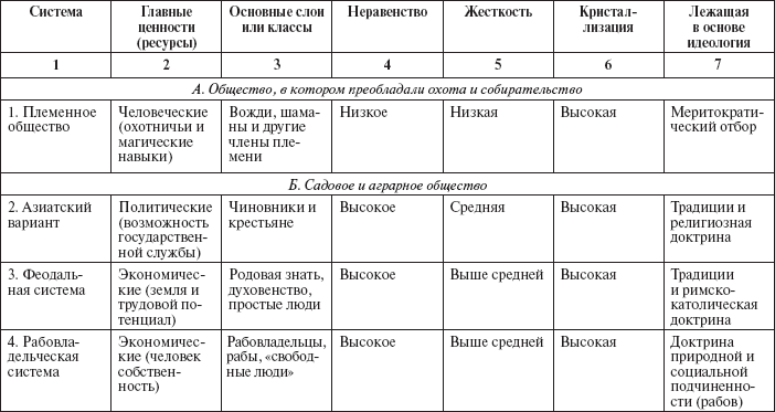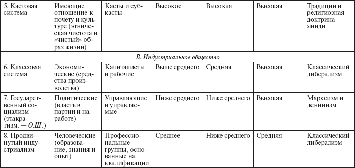 Таким образом, стратификационные формы, представленные в табл. 4.1, ее составитель рассматривал скорее как идеальные типы, а не как жизнеспособное описание реальных систем прошлого и настоящего. Эти идеально типичные модели тем не менее могут помочь нам понять эмпирические системы. Действительно, поскольку общество эволюционирует через постепенное наложение новых стратификационных форм на старые (и частично вытесненные), то становится возможным интерпретировать современные системы как комплексную смесь из нескольких идеальных типов, представленных в табл. 4.1.