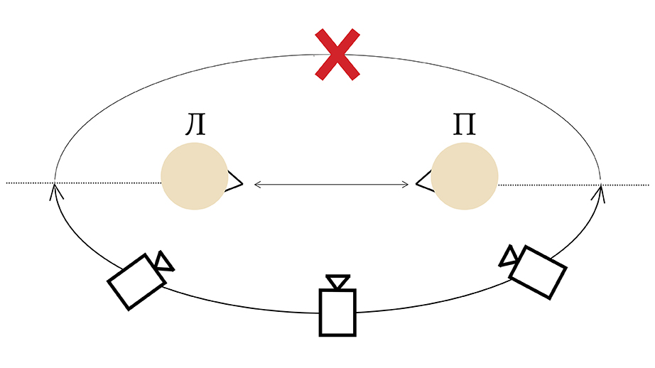 Так что же получается, что у нас нет места, где развернуться? И никогда не стоит пересекать линию взаимодействия? Конечно, все можно. Просто перед пересечением линии сделайте один кадр с самой линии – в анфас, когда видны оба уха)). Таким образом, мы подготовим зрителя к переходу на другую сторону.