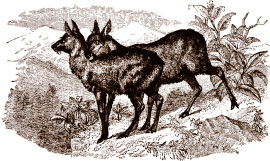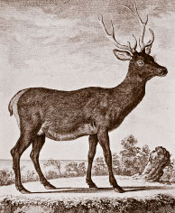 Благородный олень (Cervus elaphus) [или марал. – Здесь и далее примеч. ред. идут в квадратных скобках. ] отличается круглыми стволами и ветвями своих рогов, которые бывают только у самцов. Это красивое, стройное, изящное животное с широкой грудью и длинной головой, с живыми глазами, имеющими овальные зрачки. Из слезных ямок их вытекает жирная, кашицеобразная масса. Величина оленя – 1,85–2,15 м, причем 15 см занимает хвост, высота плеч 1,2–1,5; общий вес до 12 пудов [около 192 кг]. Самки меньше. Шерсть состоит из ости, серовато-бурой зимой и красновато-бурой летом, и пепельно-серого подшерстка. (А. Брэм. Жизнь животных, т. 1.)