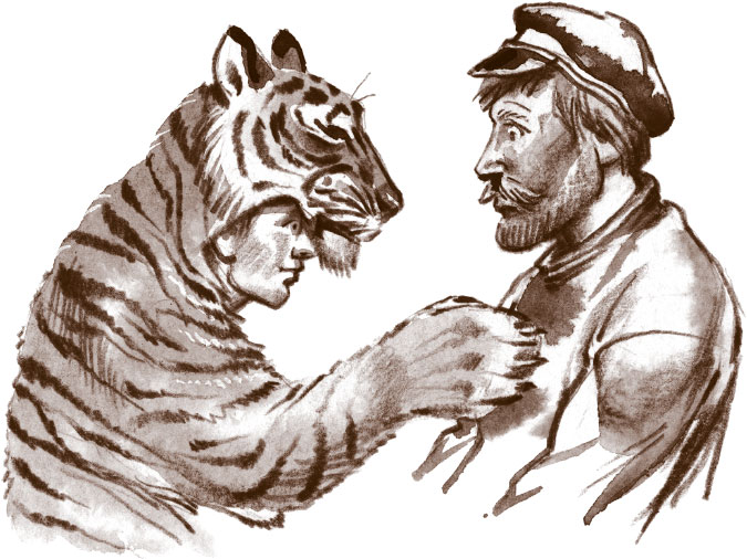 Но тигр не спешил нападать на отважного охотника. Он медленно встал на задние лапы и сказал человеческим, очень знакомым боцману голосом: