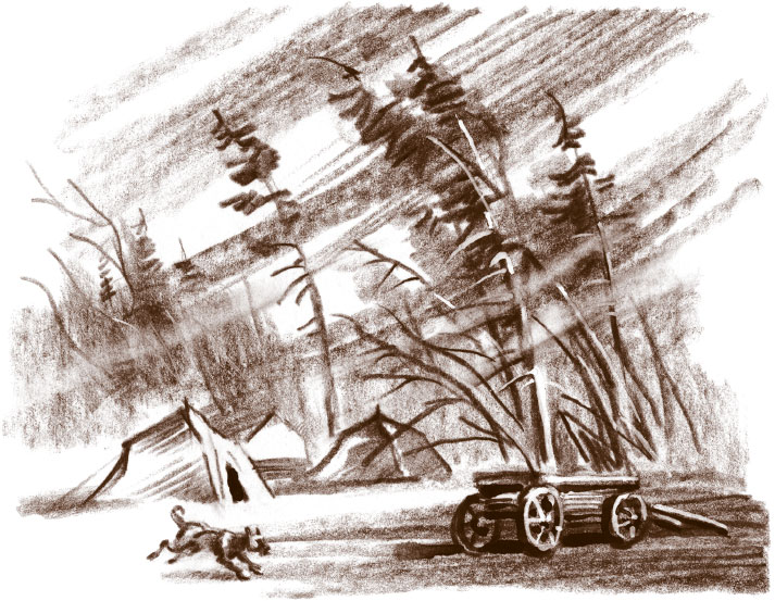 Друзья быстро съели фасолевый суп и рагу из рябчиков с ржаными сухарями и салом и стали проверять крепления палаток, затягивая туже узлы расчалок[26], которые были привязаны к колышкам, вбитым в землю. Потом охотники согнали лошадей, привязали их веревками к телегам, а котлы с супом вкопали в землю в центре самой большой палатки.