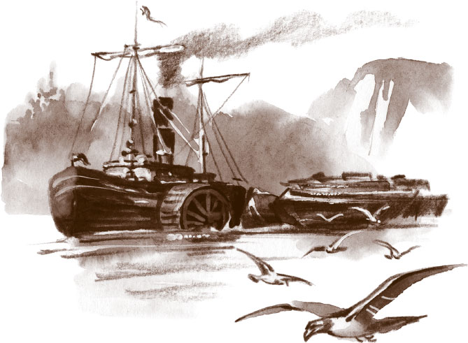 Вверх по реке шел старый двухмачтовый буксир американского типа с длинной и высокой надстройкой, возвышавшейся над палубой. Буксир тянул за собой две баржи, соединенные друг с другом бортами. Вблизи пристани буксир уменьшил скорость, чтобы ослабить канат, после чего отцепил баржи.